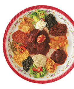 料理は基本的にひとつの大皿に盛られ、それをみんなでシェア。取り皿もフォークもナイフもない。テフという穀物の粉で作る“インジェラ”と呼ばれるクレープをちぎり、それで包んで食べる。
