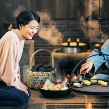 飾り提灯が下がり、昭和の懐かしい雰囲気の「ヨッテマレ酒場」、毎晩“じゃわめぐショー”が披露されるステージ、さらにそこから奥に進むと、年中、青森四大祭りが一挙に体験できるショーレストラン「みちのく祭りや」がある。ここは、鍬の上で海の幸・山の幸を自分で焼くお祭り焼きや、八戸の郷土料理せんべい汁などのみちのくのお料理が楽しめるが、その後のショーがまたすごい。