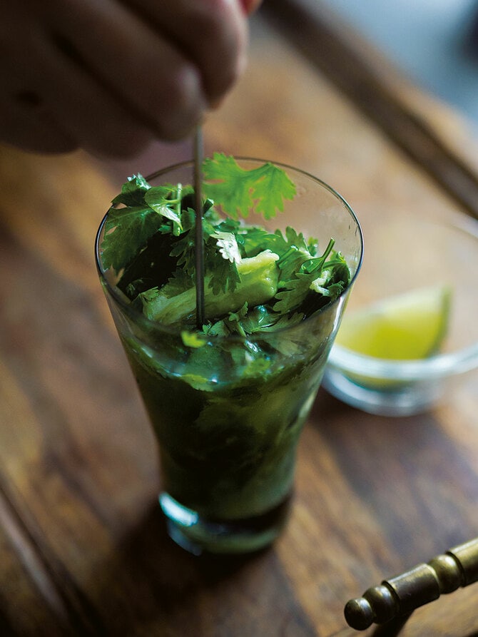 グラスに焼酎、粗く刻んだパクチー、叩いたキュウリを入れ、炭酸水を注ぐ。仕上げにライムを搾る。