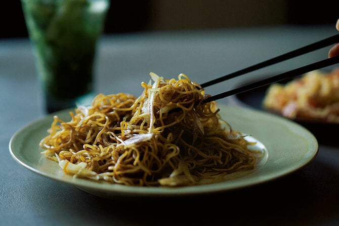 (1)フライパンにサラダ油を中火で熱し、蒸し麺を入れて、水大さじ2を加える。箸でほぐしながらしっかりと焼き色がつくまで炒め、醤油を回しかける。