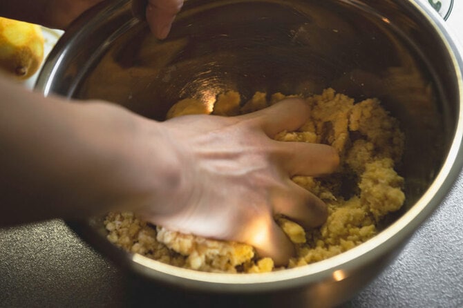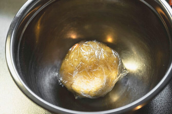 (5) ボールの中で5分ほど生地を練り、ラップに包んで30分ほど寝かせる。
