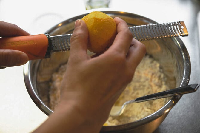 (4) レモンの皮をすり入れ、ベーキングパウダーと牛乳も加えてよく混ぜる。