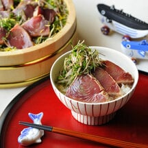 その後に登場する「宝楽盛り」は、大分名産の竹をモチーフにした器とともに、酢の物、八寸、お造りを盛り合わせたもの。何から食べようか迷ってしまうのも、また楽しいひとときです。