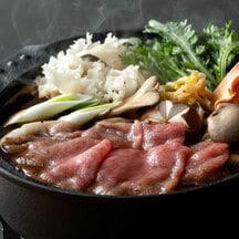 メインの台の物は、旨み豊かなスッポン出汁に、牛肉、猪肉、鹿肉、穴熊肉(!)をくぐらせていただく「山のももんじ鍋」。引き出し式の器に美しく盛られた薄造り肉は、艶めかしく食欲をそそり、思わず喉がなります。