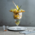 チョコレートの花の中心にはカカオニブの糖衣掛けとチョコレート風味のクレーム・シャンティイが。それを割ってグラスの中へと進むと、パリパリとしたアマゾンカカオのカカオニブのチュイルとアマゾンカカオを使った薄い飴、アマゾンカカオのソルベが織り成す繊細な層の下から、風味が濃厚なチョコレートのアイスクリームが現れます。