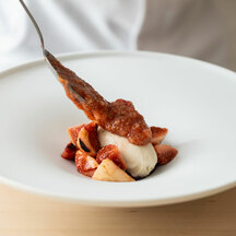 ゼラチンの薄い膜に閉じ込められた、愛媛産「せとか」の薄皮まで使った球体状のジュレの下には、同じくせとかの薄皮まで使ったグラニテが。みずみずしく濃厚な味わいと香りが弾けます。