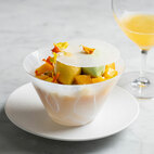 グレープフルーツの苦みが清々しさを添え、最後に回しかけたレモンオリーブオイルと洋梨、山葵が心地よく調和。ヨーグルトのさわやかさとマッチします。