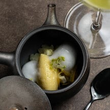 毎月8日間のみ提供される、「休日喫茶室」と名付けられたコースは、料理とデザートを織り交ぜた全7品とペアリングドリンク(アルコール、またはノンアルコール)。