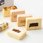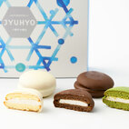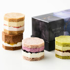 名産の大和茶を生かした濃度が違う5段階の抹茶大福と、ほうじ茶大福を詰め合わせに。大福の中には塩こし餡とともに、それぞれ抹茶とほうじ茶の生クリームが入っている。