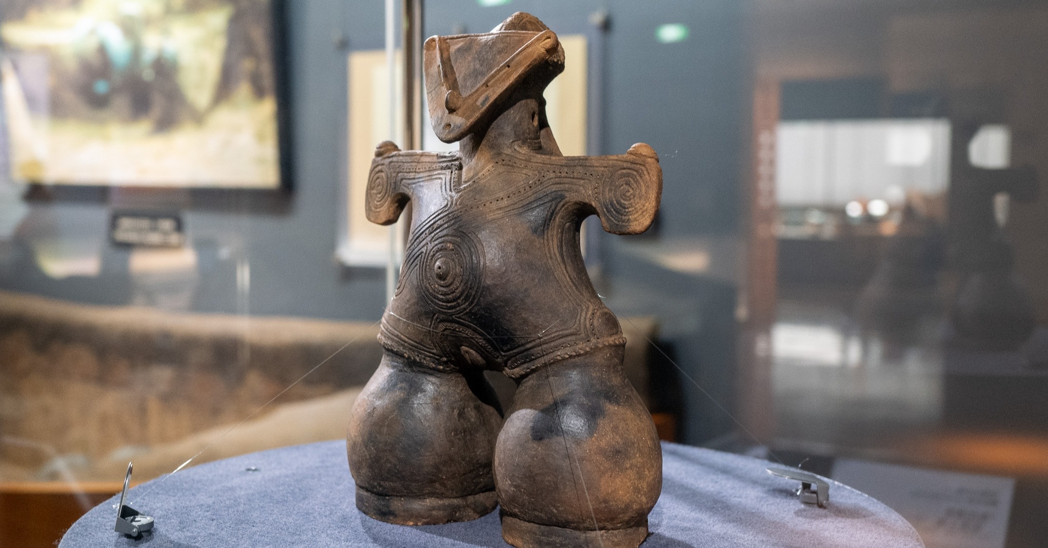 もうひとつは「仮面の女神」。逆三角形の仮面をつけていて、神に代わってマツリをする女性を表現したと考えられ、死と再生のマツリに使われたのではないかと推測されています。