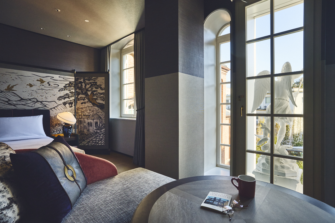 白いアーチ窓の向こうに大天使が立つ一室に滞在しながら、心安らかに至福の時間を過ごせるのです。