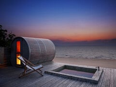 朝は、海上に浮かぶラウンジで360度の絶景を望む「朝焼け海上ラウンジ」や、砂浜に設置されたバレルサウナで気持ちよく汗を流し、海上に浮かぶ外気浴でととのう「サンライズサウナ」で、五感を開放するひとときを。