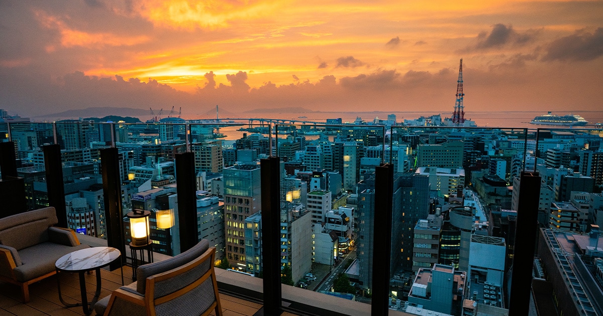 到着の瞬間にゲストの心をつかむザ・ゲートホテルならではのウェルカムサプライズ。福岡でのそれは、最上階「テラスラウンジ」の眺望。ビル群の向こうに博多港を一望でき、誰もが海の近さに驚くことでしょう。