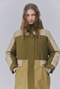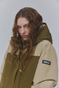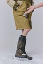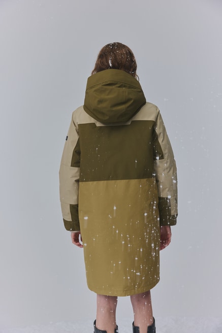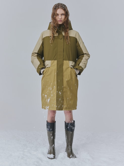 防水性・透湿性・防風性に優れたゴアテックスを採用したロングインサレーションジャケット。カラーブロックデザインでファッショナブルな雰囲気を格上げ。ゴアテックス インサレーション カラーブロックジャケット(テラヴェルデ カラーブロック)110,000円。コテージ ラバーブーツ(ヴェールオリーブ)33,000円。