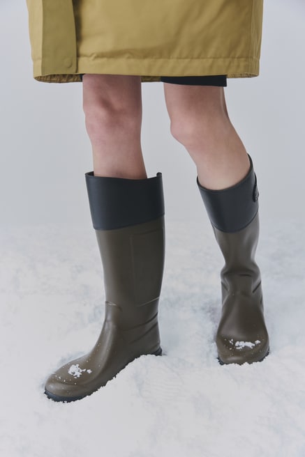 リラックス感のあるシルエットで人気のゴアジャケットは今季、ファッショナブルなカラーブロックデザインで登場。1枚で着映えするアイテムだからこそ、潔くストイックに着こなしたい。英国のカントリースタイルに着想を得た「コテージ ラバーブーツ」で、タイムレスな気品を添えて。
