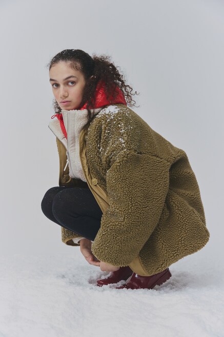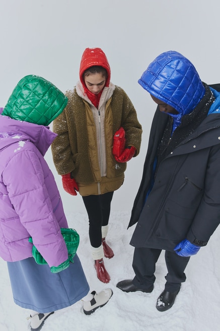シェルパジャケットを2枚重ねた、目にもぬくもりを感じる防寒性を高めたスタイリング。上に羽織ったジャケットはリバーシブル仕様で、シェルパとキルティングという2つの顔を楽しめる。赤のバラクラバとラバーブーツを差し色にして、エネルギッシュに冬を体感し尽くそう。