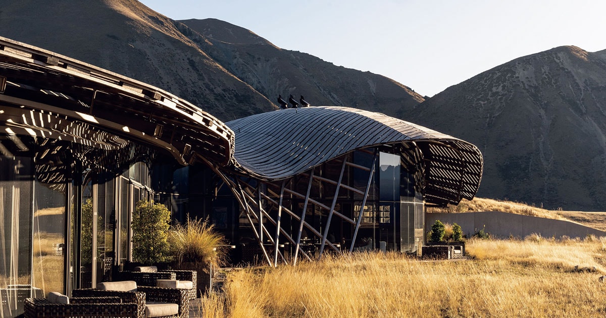 ニュージーランドの南島、クィーンズタウンから車で2時間半ほどの山麓にあり、館内の大きく切り取られた窓の先には迫り来るような雄大な山景色が広がっている。