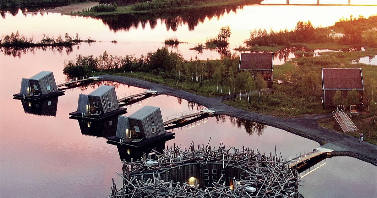 川に浮かぶ鳥の巣のようなユニークなメイン棟が目を引く「アークティック・バス」は、スウェーデン・ラップランドの奥地にあるデザイナーズロッジ。