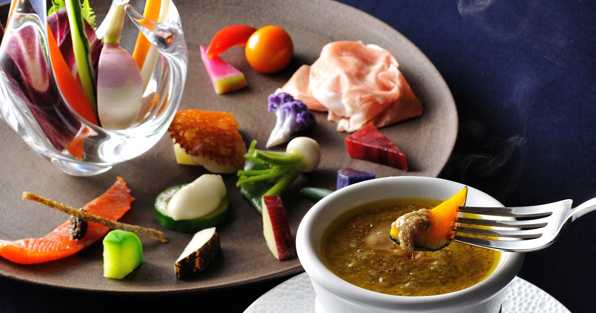 時期によりますが、野菜の一部は施設内のアグリガーデンで育てたものを使っているそう。内容も日によって変わります。これからの季節は根菜のバリエーションが増えるとのことで、温かいバーニャカウダソースがぴったり。