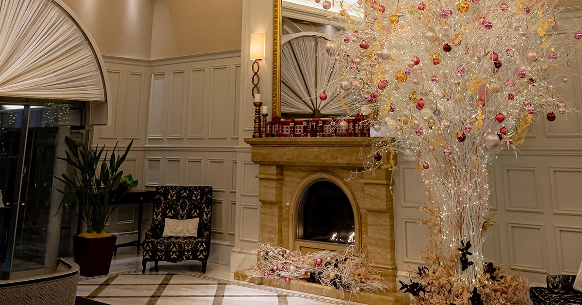 メインツリーが飾られるのは、ロビーのマントルピースの横。暖炉に火が入ったロビーは、まるでヨーロッパの邸宅に招かれたかのような雰囲気、ホリデーシーズンのあたたかな空気に満ちています。