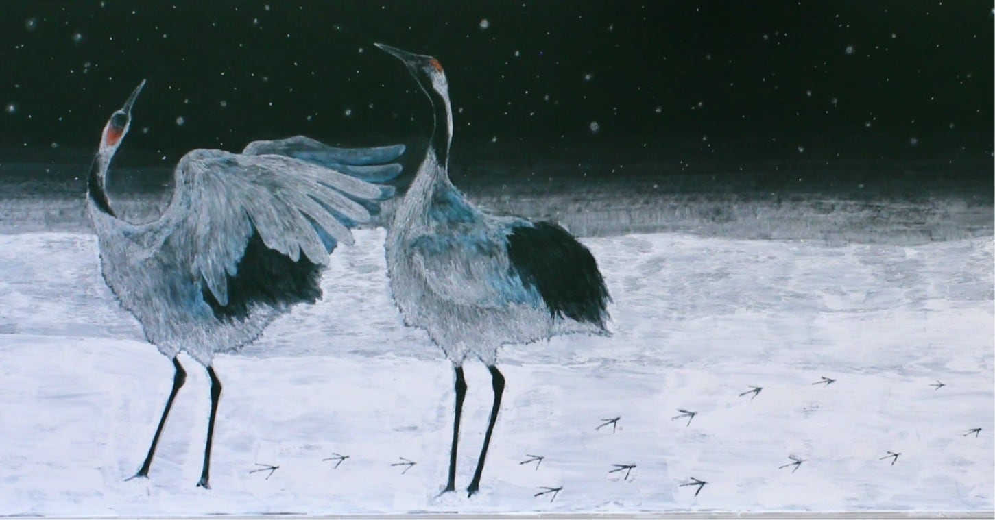 制作したチーム「いかのおすし」(2名)は、「真っさらで何も無い雪景色に、鶴が二羽だけで歩いている場面を描きました。夏真っ只中の今、涼しさを感じるように白と青、赤の3色だけで塗り、濃淡で変化をつけました。心が静まるような雪景色と、そんな世界でひそかに歩く鶴のロマンチックさを感じてほしいです」と制作エピソードを語っています。