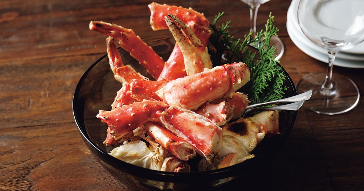 獲れたての蟹を生きたまま急速冷凍した生タラバカニなので、ボイルしたものよりも鮮度のよさが光る。特大サイズの脚には身がぎっしり詰まっていて、ぷりっぷりで甘さも抜群!