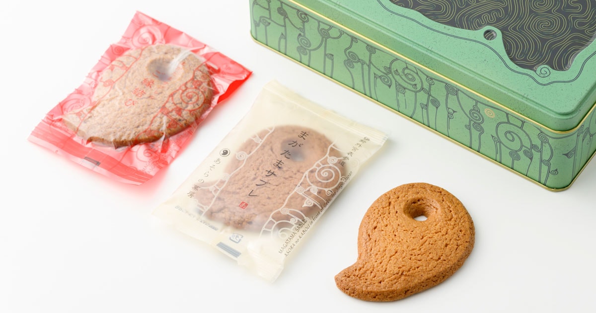 三種の神器の一つである勾玉がモチーフ。ザクザクとしていて口溶けがよくバターの風味が広がる。