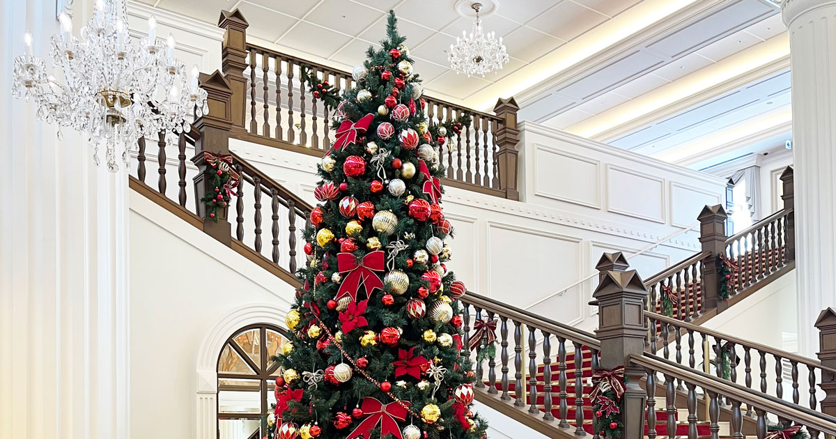 階段の横には、赤とゴールドを基調とした大きくてクラシックなツリーが飾られ、訪れる人をあたたかく迎えています。ロビー全体の上品で重厚感のある雰囲気にしっくりとなじんでいます。