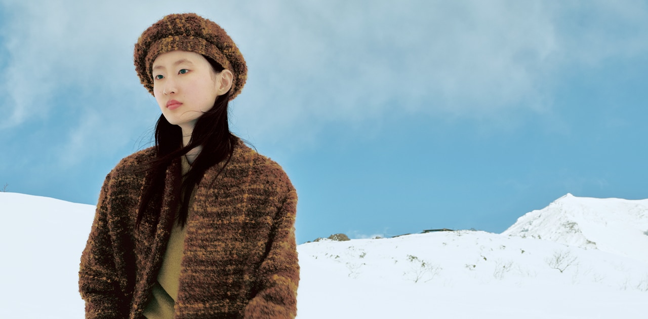 モヘア、ウール、コットンのヤーンから生まれる、ふっくらとしたブークレ・ファブリックが豊かな表情を添える。同素材のパンツとあわせたミニマルなスタイルが、希少な素材の魅力をいっそう際立たせていく。