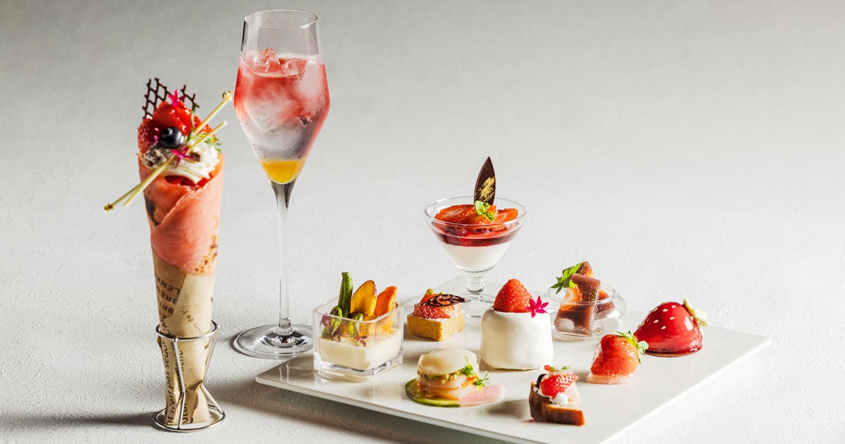 「いちごとヨーグルトバジルのバシュラン」などスイーツ全5種、「いちごとモッツアレラと生ハム 25年バルサミコとビーツタルト」などセイボリー全5種。それらに加え、“いちご大福”など3種のスコーンをドリンクとともに提供。
