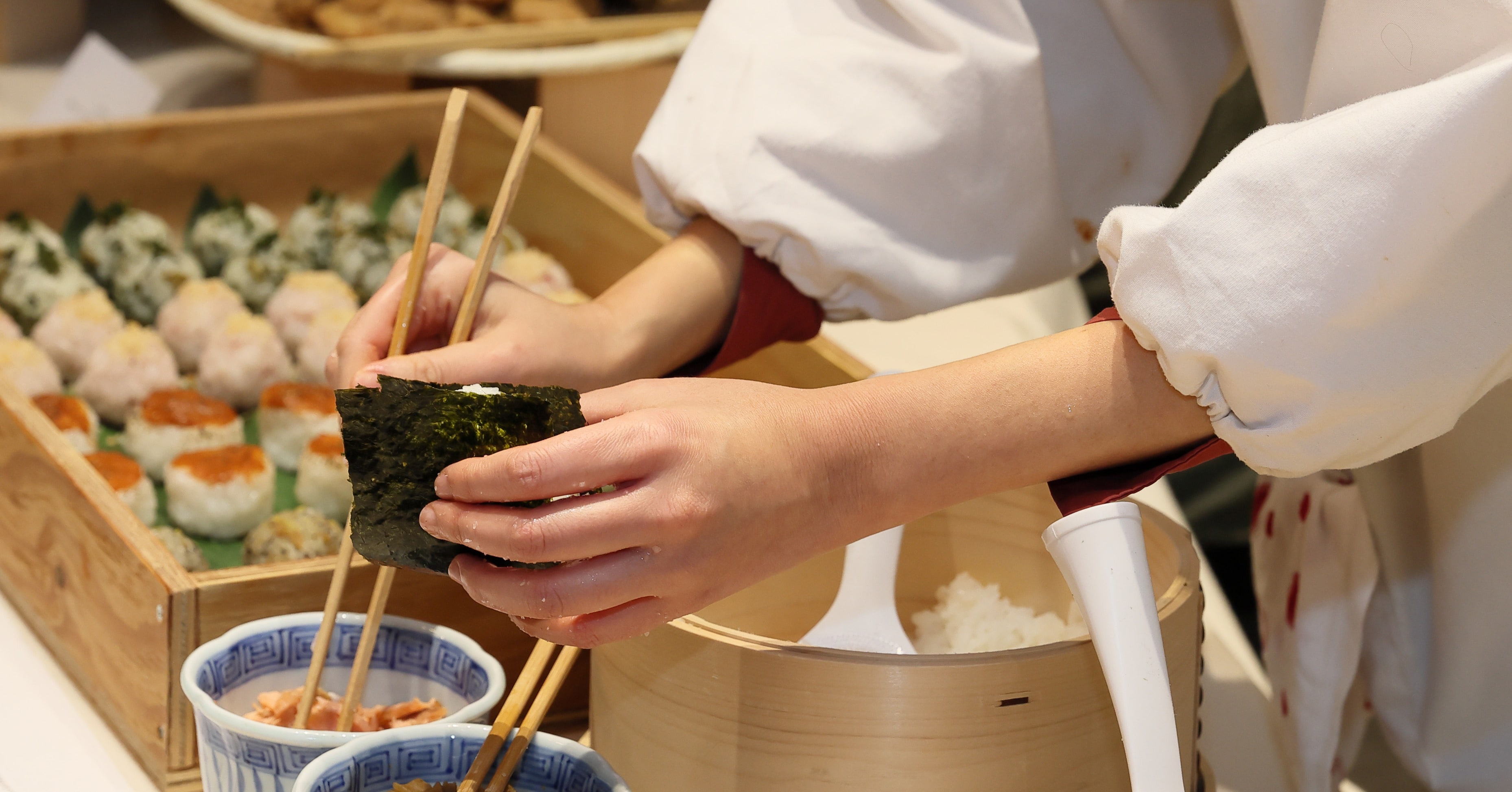 忘年会のメインは、米どころ新潟のお米。会場には、新潟の食材を使ったこの日だけの特別なおむすびやおばんざいがずらりと並びます。菅本さんの「ぜひ新潟のお米をたくさん召し上がっていただきたい」という思いから、おむすびは1人1合食べられるほどたっぷりと用意されました。