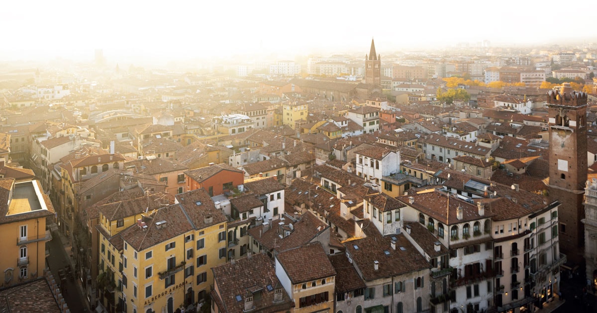 ヴェローナを訪れたら、まずは街の中心にある「エルベ広場」と「シニョーリ広場」の間にそびえ立つ「ランベルティの塔」に昇ってみるといい。夕映えに照らし出された優雅な街並みを俯瞰すると、時空を超えてロミオとジュリエットのストーリーに描かれた典雅な情景や音楽が脳裏に浮かんでくるに違いない。