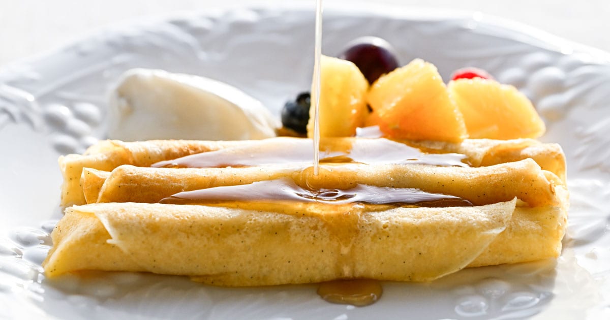 名物「シンパンケーキ」は、ハワイで「ザ・カハラ・ホテル&リゾート ホノルル・ハワイ」が創業した1964年当時から続くメニューです。シン=Thin(薄い)、つまりごく薄く焼かれたしっとりとしたパンケーキをくるくる巻き、メープルバターソースをたっぷり。巻かれた層の間に沁み込みます。そんな名物料理を横浜で食べられるなんて幸せなことですよね。