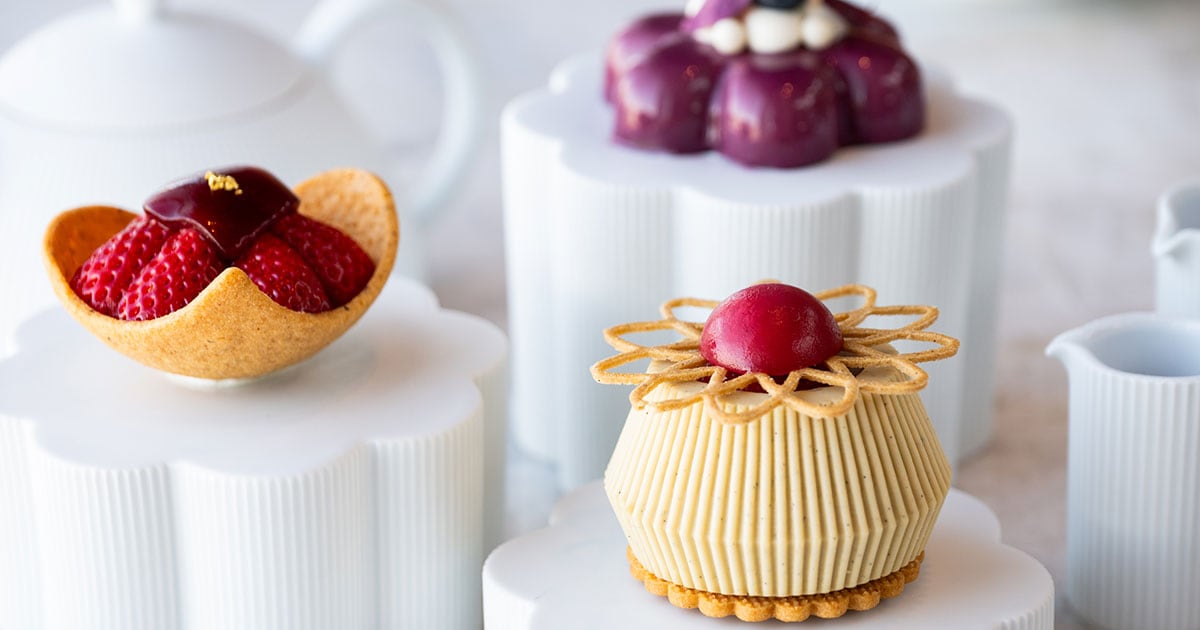 そう語るのは、エグゼクティブ ペストリーシェフのジュリアン・ペリネさんです。これまでの伝統的な三段トレイのスタイルをやめ、代わりにテーブルに運ばれてくるのは、オリジナルで製作された美しい有田焼の器の数々。セイボリーからスイーツ、グラスデザートまでコース仕立てで順に提供されていきます。