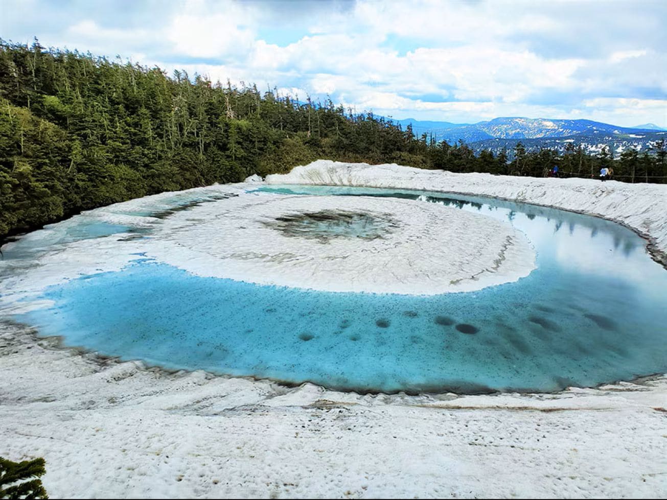 まだ雪が残る登山道を歩いた先にある、神秘的な光景に感動すること請け合い。沼、空、天候などさまざまな自然条件が一致したときにのみお目にかかれる奇跡の光景に、思わず息をのむ。
