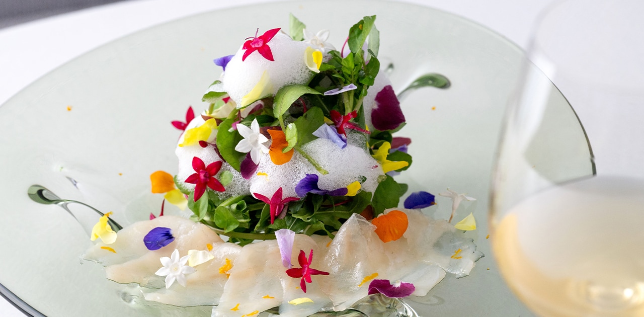 「ふぐのカルパッチョ 柑橘のスキューマ」は、ふぐの薄造りをカルパッチョに仕立て、軽やかな柑橘の泡を添えた一品。春らしい3種のハーブの青い香りがふぐの繊細な風味を引き立てます。合わせたワインはイタリアの微発泡、ソーヴィニヨン・フリッザンテ。柑橘やハーブのニュアンスを持つ爽やかな口当たりは、まさに今の気分にぴったり!