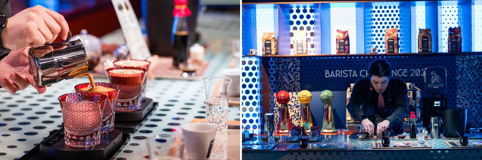 エスプレッソは、抽出温度や抽出時間(粉の細かさ)、仕上がりの量を調整し、豆の個性を引き出すよう、バリスタの細心のコントロールによって仕上げられます。豆ごとの特徴に応じて抽出のアプローチを変える判断力も含めて、バリスタの技術が問われるポイントです。一方で、後半に登場するシグネチャードリンクは、バリスタそれぞれの発想やストーリーがより色濃く表れるパートで、見どころのひとつになっています。