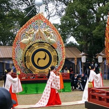 今年舞われる舞楽 *振鉾、*蘇利古、春庭花、*菩薩、*獅子、*迦陵頻、*胡蝶、仁和楽、*太平楽、納曽利(*は毎年舞われる曲)
