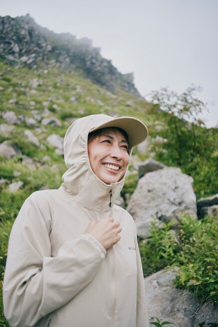 「フードがめちゃくちゃ被り心地いい!」と小椋さん。柔らかさと密着度がちょうどいいとご満悦。コロンビア独自の撥水機能「オムニシールド」は小雨程度ならしっかりと防水、サンプロテクション機能「オムニシェイド」も搭載しているので、降り注ぐ紫外線もカットしてくれます。この日はあいにくの曇模様でしたが、山頂付近は360度絶景のパノラマビューが広がる焼岳では紫外線対策も必須。低山でも高山でも活躍間違いなしです。