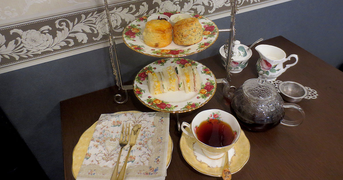 店内は、椅子やテーブルがゆったりと配され、落ち着いた英国風。暖炉を模したコーナーやティーセットが飾られたキャビネットがあり、イギリス好きなら興味津々になること間違いなしです。