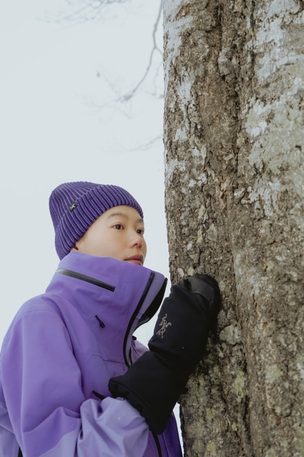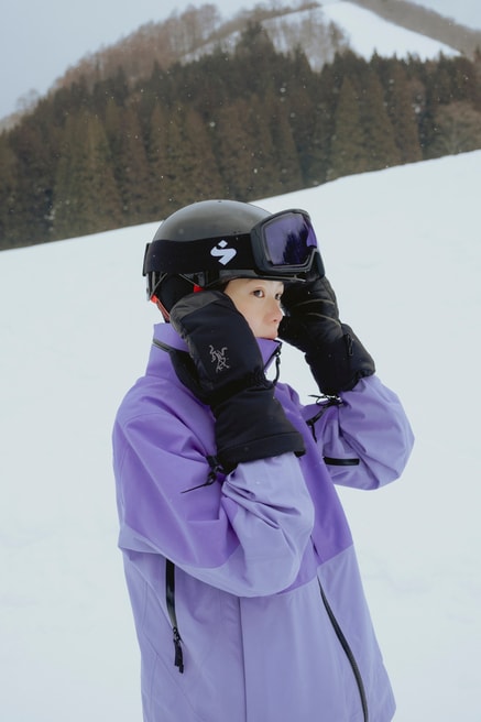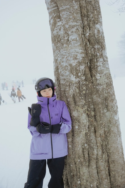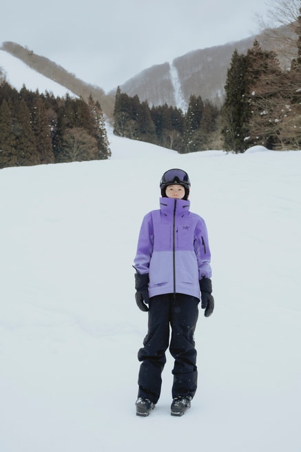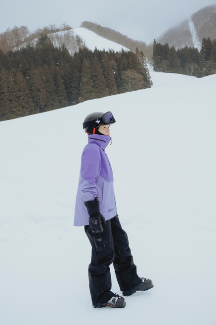 「軽くてとても動きやすかったです。ジャケットの明るい色も雪面に映えてかわいい。今日何度か転んでしまったのですが、ウエアの中に雪が入ることもなく、冷たさを感じることがありませんでした」(山本さん)。コンディションに合わせて機能をカスタマイズできるようにデザインされたジャケット。肌寒いスタート地点から稜線やビッグラインまで、さまざまなシーンで天候に対する保護性能を発揮します。前後で高さに差を付けた裾部は絞ることができ、フードを襟にしまってスタイルの変化を楽しむことも。GORE-TEX PRO ePE素材とキャンバスハイブリッド構造が耐久性、耐摩耗性、耐水耐風性を発揮し、アクティビティをしっかりサポートします。4色展開で、山本さん着用のモデルはアスター/ブラックモデル