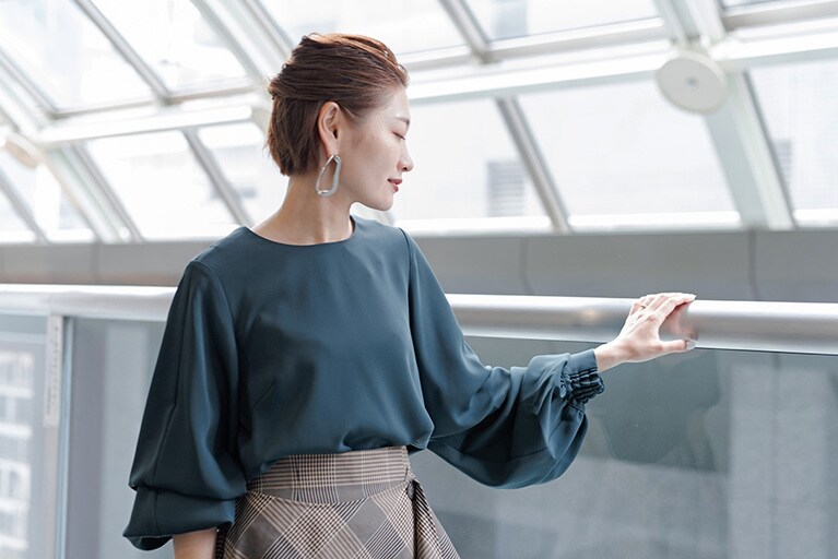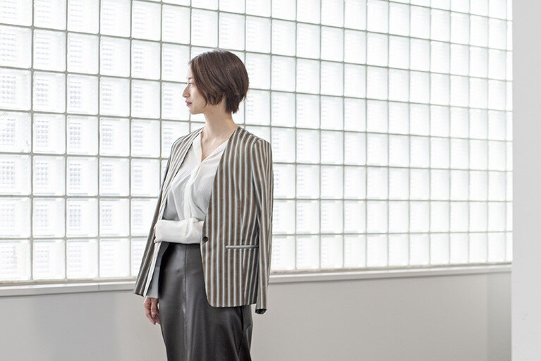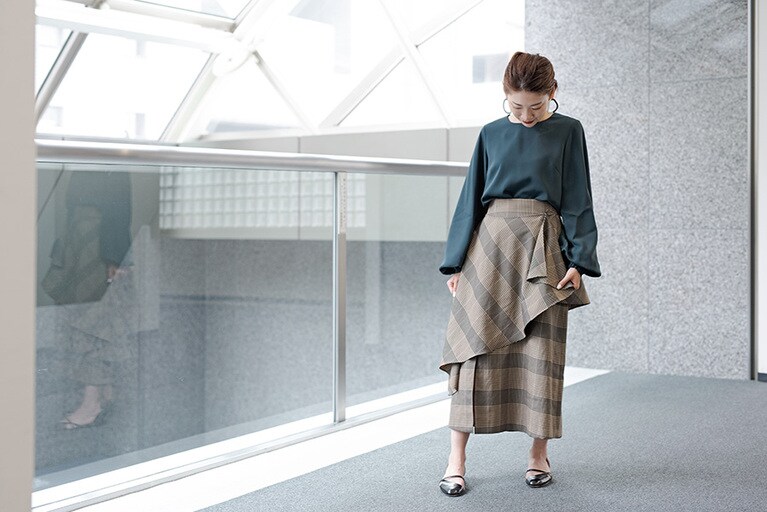 クルーネックニット15,500円/WRAPINKNOT、ストレッチハイウエストワイドパンツ15,000円/STUDIOUS、イヤリング10,000円/JANE SMITH (以上STUDIOUS WOMENS新宿店 03-5925-8966)、シューズ本人私物。 フリルブラウス9,800円、セミワイドパンツ21,000円/CITY(STUDIOUS WOMENS新宿店 03-5925-8966)、シューズ本人私物。 ジャケット36,000円/CITY(STUDIOUS WOMENS新宿店 03-5925-8966)。 マルチスリーブブラウス9,800円、チェックスカート19,000円/UNITED TOKYO (UNITED TOKYO WOMENS 新丸ビル店03-6273-4944)、シューズ、イヤリング本人私物。 オーバーシャツ13,800円、エコレザーフロントスリットスカート18,000円、ストライプジャケット29,000円/CITY、イヤリング6,000円/petite robe noire (以上STUDIOUS WOMENS新宿店 03-5925-8966)、シューズ本人私物。
