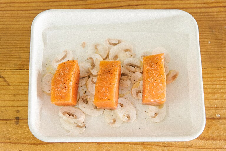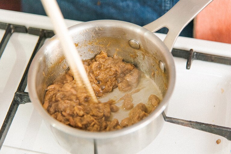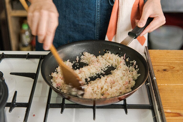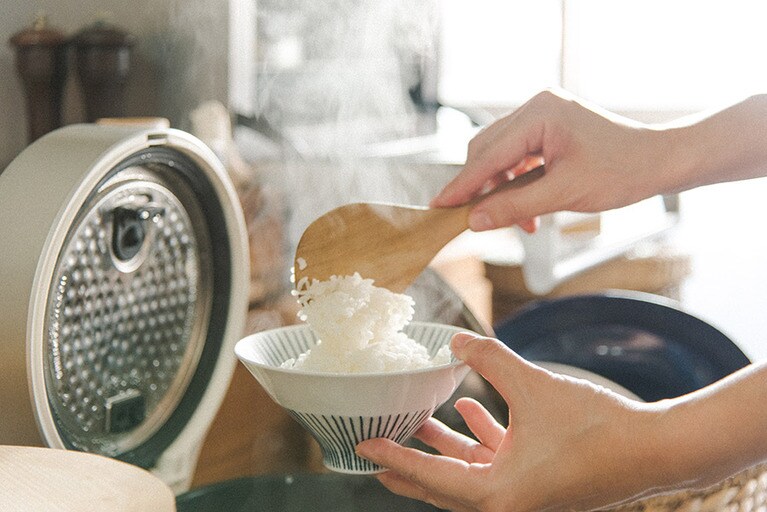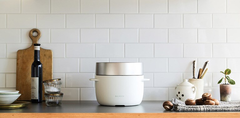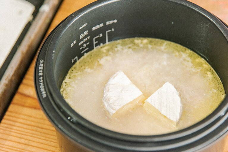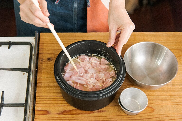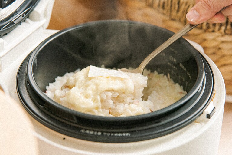 バルミューダキッチンスタッフの木下直子さん(左)と山田英季さん(右)。 チーズがとろけて至福の味! カマンベールチーズリゾット 材料を入れたら、炊飯器にお任せ。刻みカオマンガイ。 簡単なのに小料理屋風の仕上がり、ツナ甘辛煮のわさびごはん。