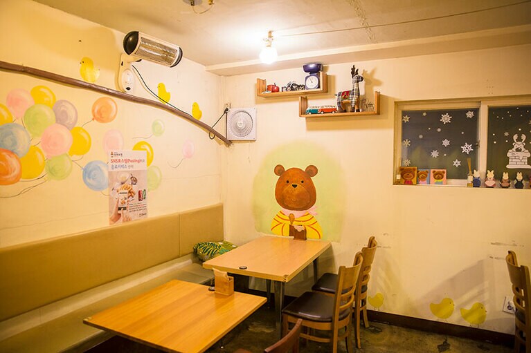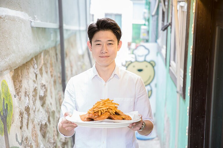フライドチキンコンボセット 28,000ウォン。 酢漬け大根は、韓国では揚げ物に添える定番の副菜。ここのものはレモンの香りが爽やか。えびせん付き。 「もやしサラダ」(左下)はチキンを引き立てる名脇役。茹でたもやしときゅうりとタマネギに、醤油ベースのドレッシングがかかっている。