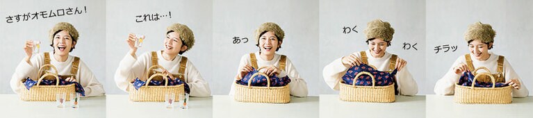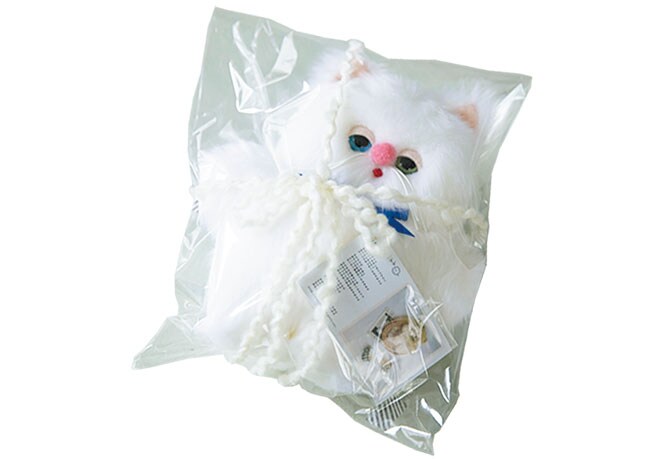 プレゼントは、2人ともがファンのpienilusikkaさんにオーダーしたぬいぐるみ「もけもけ」。オモムロニ。さんの愛猫「アイビー」の真っ白な毛とオッドアイに、やはり大好きな横浜DeNAベイスターズのイメージカラーリボンを巻いてほしいと注文。「もけもけ」 9,000円(参考価格)/pienilusikka ※現在はメールでのオーダーは休止中で、イベントなどでのみ受付。奥はおまけプレゼントの絵本『白猫』(ほるぷ出版)。 菊池さんからのカードは、猫柄の古いポストカード。 左:オモムロニ。さんから菊池さんへの贈りものは、台湾のイラストレーターが描いたフルーツ柄のグラスとお茶。フルーツコップ ブドウ、バナナ、スイカ、イチゴ、レモン、パイナップルの6種、 各950円/CLASKA Gallery & Shop