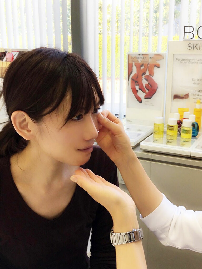クラランスにケアを習いに行きました。 クラランス・野原純子さん。 顔には脂肪がたまりやすい場所がある。 ケアは「顔の中心から外へ」「上から下へ」。 「V コントア セラム」の使用量。3~5プッシュで多めです! (準備)指先を鎖骨のくぼみに置き、優しくくぼみに圧をかけ、続けて3度プレスします。 「V コントア セラム」を手に取る。 規定量(3~5プッシュ) 量を取ったら、両手のひらでなじませます(大事です!)。 透明になるまでなじませます。 塗布する順番。 ①顔の中心 ②顔の側面 ③顔上部の中心 ④顔上部の側面 ⑤右首の上部 ⑥右首の下部 ⑦左首の上部 ⑧左首の下部