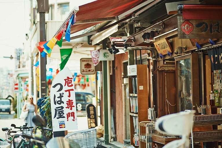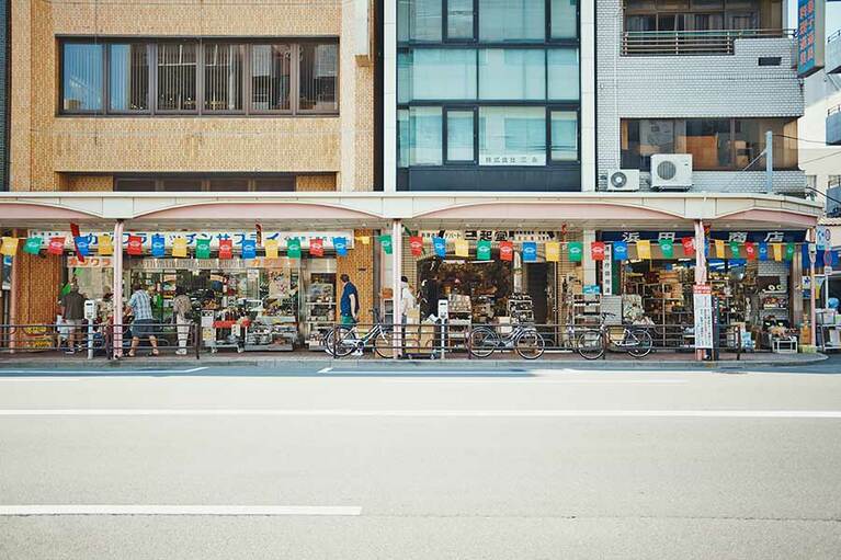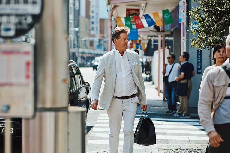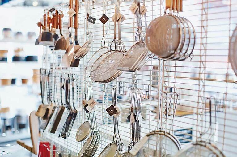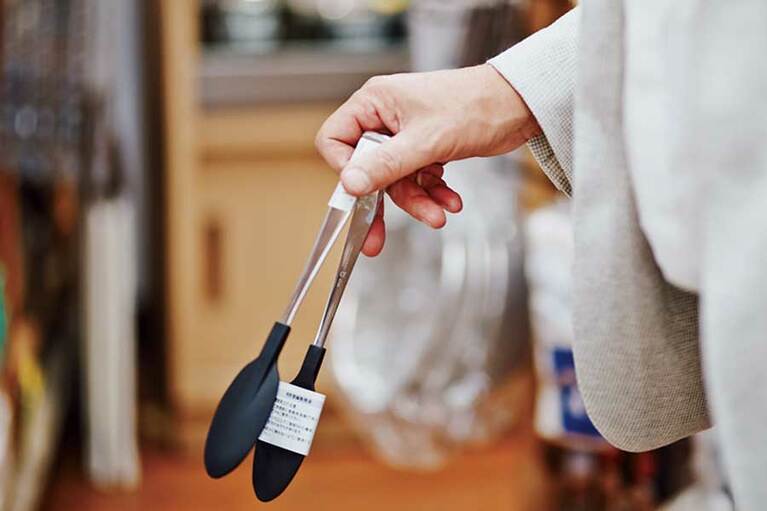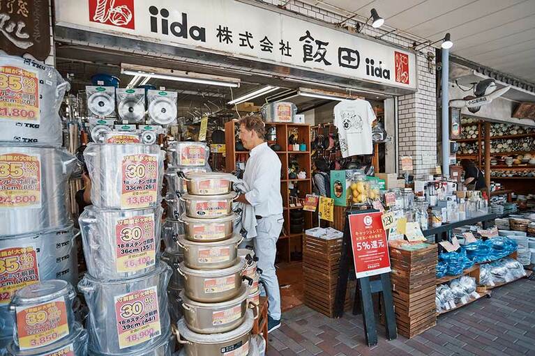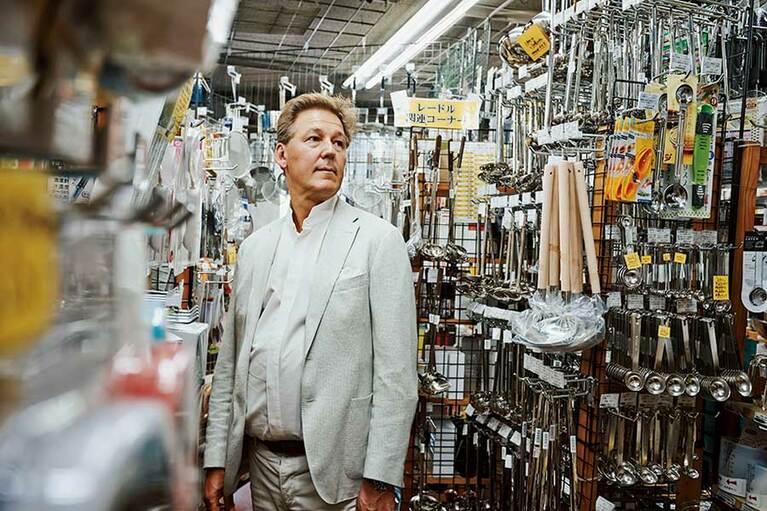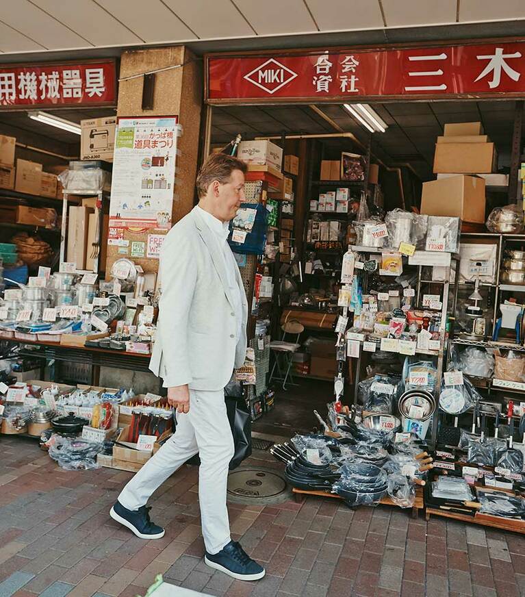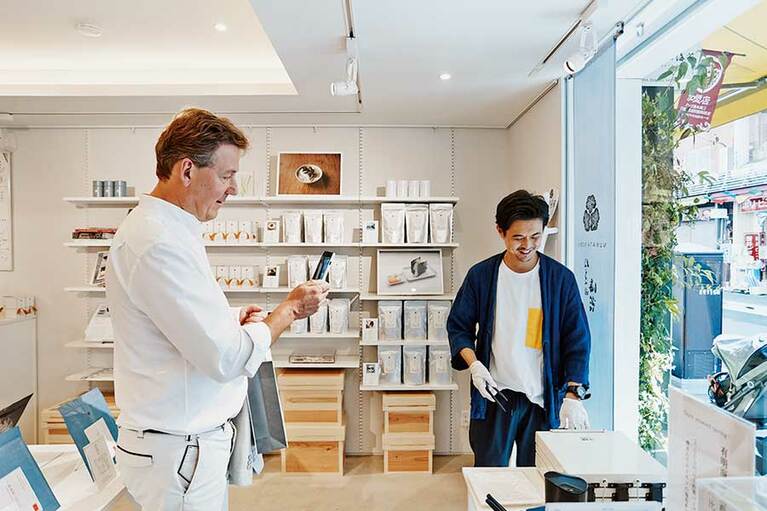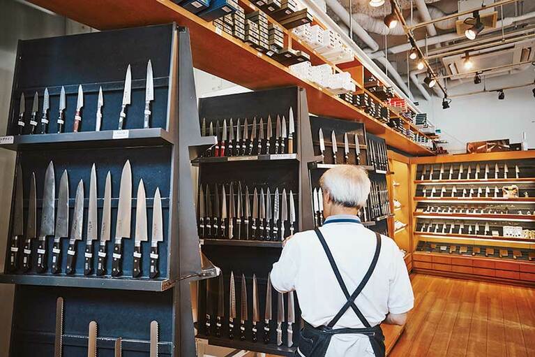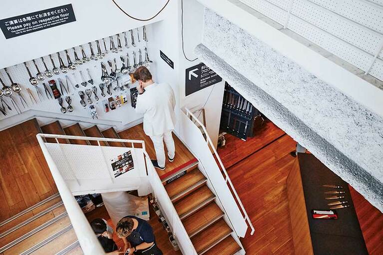 合羽橋をぶらぶら散策。 「ドウモ~! ゴメンクダサイ」 「ざるやアク取りひとつ取っても、日本のものはクオリティが違うね。手入れしやすいように、網を全て溶接しているなんて知らなかったよ」 「よし! 包丁研ぎにチャレンジ!」 「これまでは自己流で研いでいたんだけど、これでコツはつかんだ!」店頭では、店員さんが包丁を研いでいる姿を見学できる。 4代目社長とはい、チーズ。 みんな、何を買ったのかな? アイスクリームに関する商品がずらりと並んだ棚。「棚のテーマの作り方も面白い」と、ユニークなプレゼンテーションに見入る。 「いろいろあって選べないよ~」 焼き立ての海苔の香りを体験。