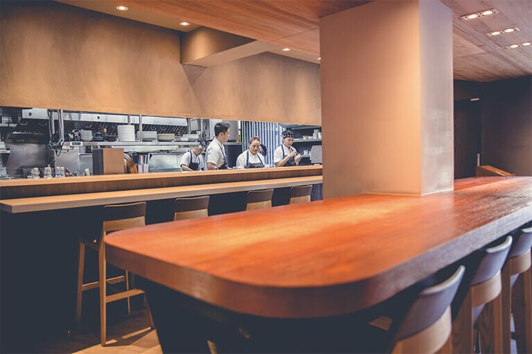 「大屯山鱒魚」880元。水のきれいな大屯山産の鱒をふっくら、こんがり焼き上げ、魚の骨でとっただしと貝「赤嘴蛤」のお粥にのせる。 「大屯山鱒魚」は、台湾の山菜「山蘇」やウイキョウと。 必食のデザートは4種ほど。「フォレノワール」(380元)は、ビターなチョコレートケーキでチェリー入りのバニラアイスを挟んでいる。マイヤーレモンのパウダーやチェリーのジュレで大人っぽい甘酸っぱさ。 ラスベガスで出会った劉シェフとメラニーシェフ夫妻。オープン当初は韓国人シェフもおり、現在は姉妹店のワインバー『BOTTOLESS』に。