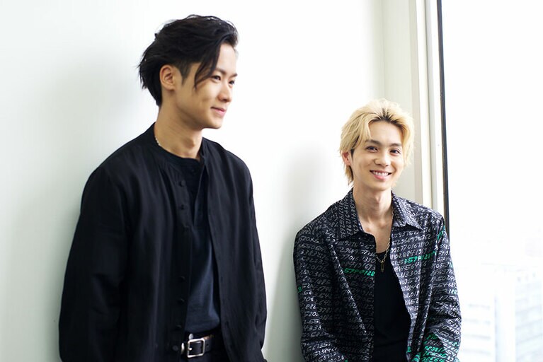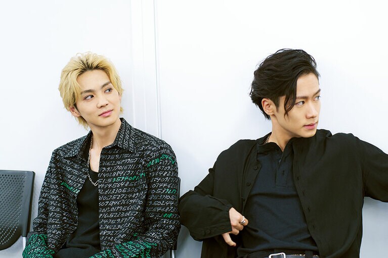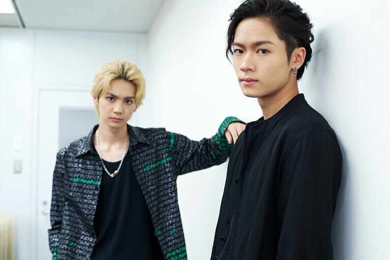 左:吉野北人さん。シャツ 31,000円/LHP原宿店、Tシャツ、アクセサリー/スタイリスト私物。 右:川村壱馬さん。シャツ 29,000円/バックラッシュ、パンツ 43,000円/キディル(キディル ルーム)、アクセサリー/スタイリスト私物 映画『HiGH&LOW THE WORST』。