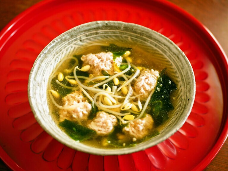鶏モヤシのショウガ風味スープ。 材料。 (1) 鍋に水、鶏ひき肉を入れる。 (2) 鶏ひき肉を箸で5~6等分に分ける。 (3) 沸いてアクが出てきたら取り、5分ほどふつふつと小さく泡立つぐらいで煮る。 (4) もやし、酒、醤油を入れて2分煮る。 (5) ワカメはザルなどに上げてしっかり水を切る。 (6) 鍋にワカメ、おろしショウガ、ごま油を入れて、さっくり混ぜる。器に盛り、食べる直前にコショウをふる。